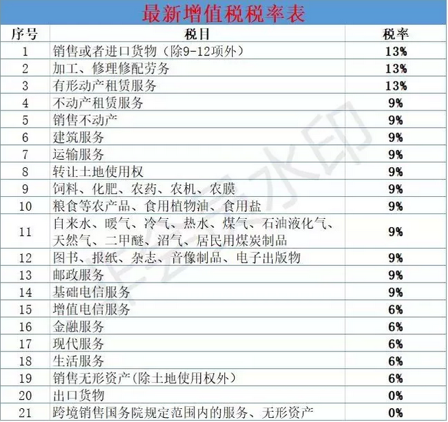 3、 銷售方想特意等到稅改確定后才開發票,怎么處理? 這要看自己議價能力,我們可以推遲付款,銷售方也會考慮資金問題 。 4、增值稅稅負降了,利潤相應增加了,對企業真的有影響嗎? 增值稅是價外稅,不影響利潤,影響現金流。 5、稅改前簽的合同,等到稅改后去開票就是按9%嗎? 要看合同執行時間,如果是稅改之后執行的,且合同當時也是按9%簽的合同,可以開9%的發票。 6、想問對于購銷雙方都有什么影響?建筑的總包合同呢? 對購銷雙方都有利,對制造業等少付3個點的增值稅稅額。老項目沒有影響,按簡易計稅,新項目,長期合同,應考慮是補簽協議,作為增值稅率變更,合同金額減少3個點。 附2019年最新增值稅稅率表 按改革后的新稅率將《增值稅稅率、征收率、預征率表》進行了調整。 一稅率 增值稅稅率一共有4檔:13%,9%,6%,0%。銷售交通運輸服務、郵政、基礎電信、建筑、不動產租賃服務,銷售不動產,轉讓土地使用權以及銷售或進口正列舉的農產品等貨物(易混項見附件1)稅率為9%;加工修理修配勞務、有形動產租賃服務和進口稅率為13%;銷售無形資產(除土地使用權 )為6%,出口貨物稅率為0;2、其余的:貨物是13%,服務是6%。 二征收率 一共有2檔,3%和5%,一般是3%,除了財政部和國家稅務總局另有規定的。1、5%:主要有銷售不動產,不動產租賃,轉讓土地使用權,提供勞務派遣服務、安全保護服務選擇差額納稅的。貨物銷售里沒有5%征收率的。2、征收率絕大多數是3%,容易與5%記混的單獨記憶一下:建筑服務,有形動產租賃,小規模納稅人提供勞務派遣服務、安全保護服務未選擇差額納稅的。3、兩個減按:個人出租住房,按照5%的征收率減按1.5%計算應納稅額。銷售自己使用過的固定資產、舊貨,按照3%征收率減按2%征收。4、小規模納稅人以及選擇簡易計稅的一般納稅人(見附件2)計算稅款時使用征收率。