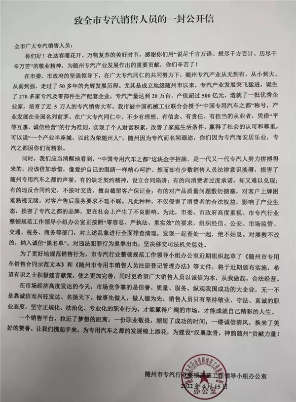 湖北隨州專汽銷售行業(yè)整頓公開信,誠信為本從我做起合法經(jīng)營
