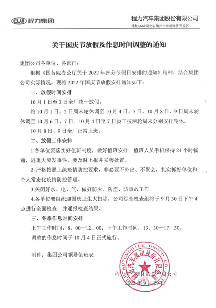 湖北程力集團關(guān)于國慶節(jié)放假及作息時間調(diào)整的通知