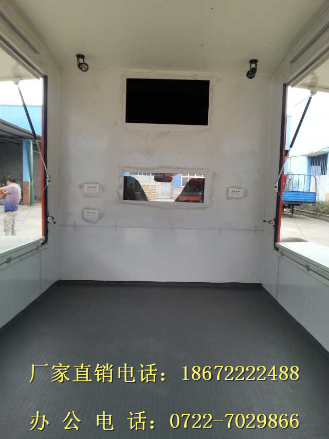 1.車廂頂部封閉選裝通風(fēng)窗時(shí),高2590mm;選裝頂置空調(diào)時(shí),高2890 mm.2左右兩側(cè)及后部均可選裝led屏、廣告滾軸燈箱、玻璃窗或上掀門。3.該車前部頂端兩側(cè)裝有喇叭,可進(jìn)行聲音宣傳.4.該車裙邊工具箱艙門可選裝.5.側(cè)部和后下部防護(hù)裝置為鋼板整體式側(cè)圍防護(hù)結(jié)構(gòu),離地高度300mm,側(cè)部和后下部防護(hù)裝置材料材質(zhì)為Q235A.發(fā)動(dòng)機(jī)型號(hào)/最大凈功率(kw)分別為:JL466Q1/46.56;6.可以選裝不同車體顏色和外觀貼畫(huà).