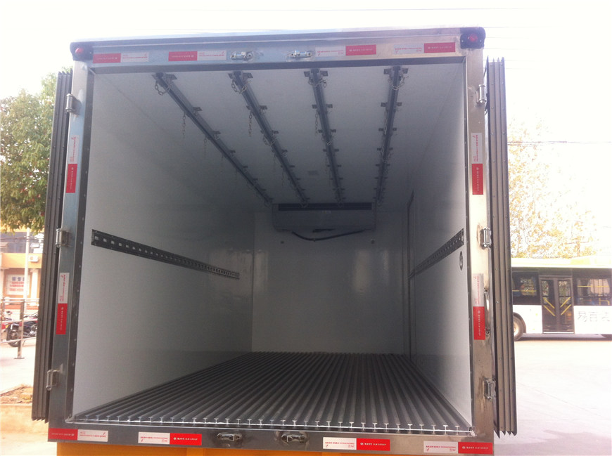 二,保溫箱體 湖北程力冷藏車的質量好不好一般因素是看箱體的質量,好的冷藏車箱體不漏熱,質量輕,箱體結實不變形起泡。湖北程力公司自主研發的冷藏車第五代產品融合:"無縫結合箱體技術”,“全自動恒溫系統”,“全方位冷藏車監控系統”,“全球冷凍數據回饋技術”,箱體填充除了保留傳統的“高密度聚氨酯”外,新增“航空材質高密度玻璃纖維”。廂板為三明治式結構,內外蒙皮,中間輕鋼龍骨架及8厘米高密度聚氨酯保溫材料,采用國際先進的大型真空負壓機一次性負壓成型,表面光潔平整,強度高,整體質量輕,保溫性能良好,無滲漏。箱體內外蒙皮可根據用戶的實際需求選用玻璃鋼板,鋁合金板,彩鋼板,不銹鋼板等材質制作。用戶也可以根據運輸介質的不同選裝滑道,肉鉤,通風槽,側開門等。