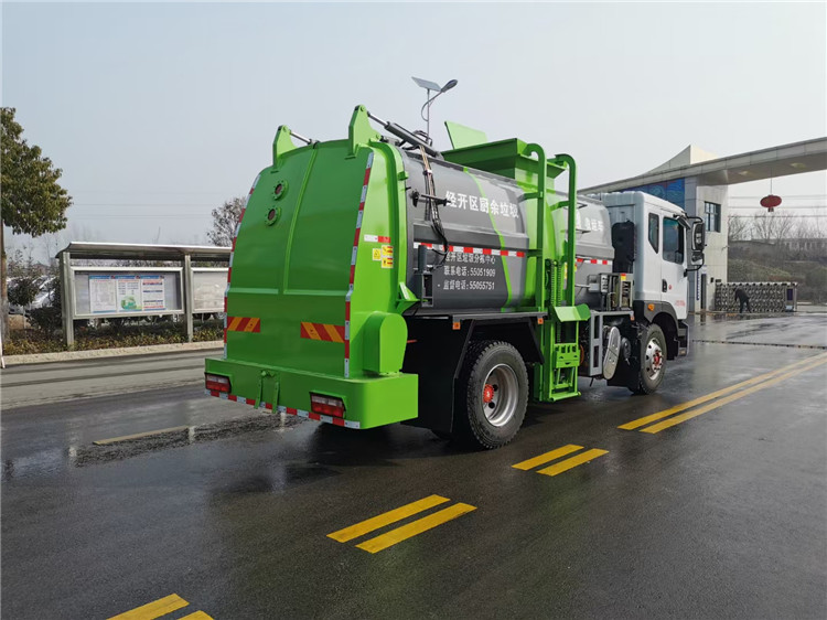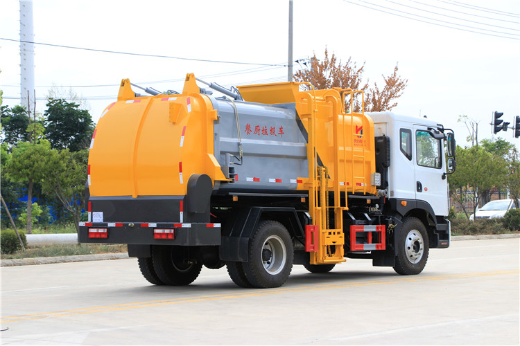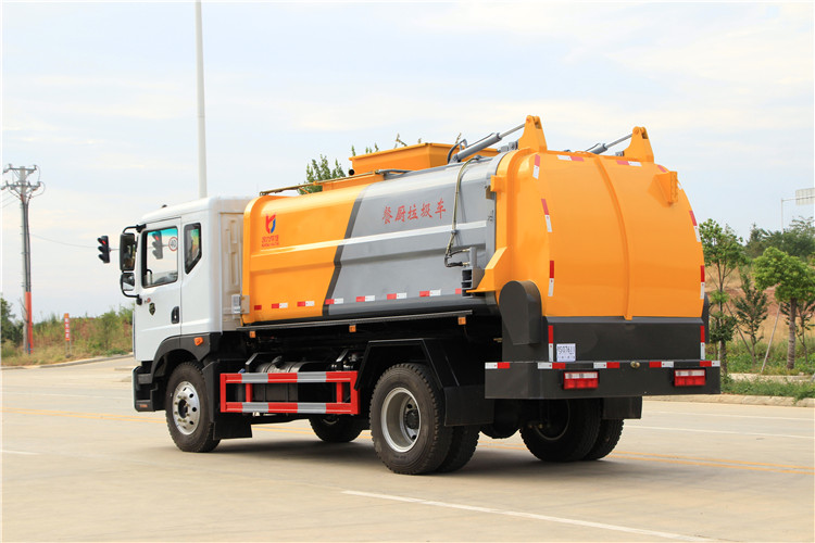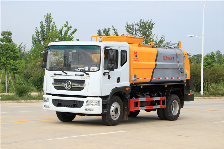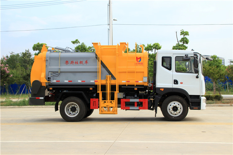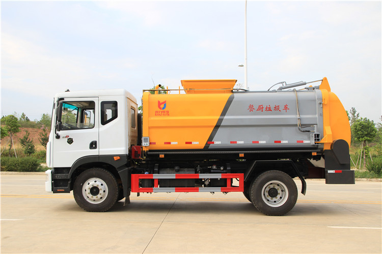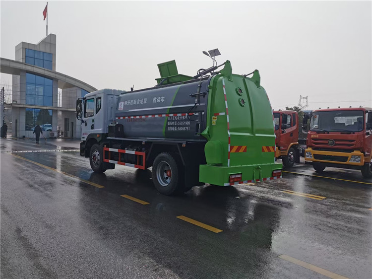 東風多利卡D9國六10方餐廚垃圾車底盤配置:采用東風D9系列新款駕駛室,4500mm軸距,搭載國六(國Ⅵ)玉柴200匹馬力/康明斯230柴油發動機,法士特8檔變速箱,9T后橋,10.00R20鋼絲胎,ABS,標配電動窗、中控鎖、鑰匙、日間行車燈、自動落鎖、斷氣剎、定速巡航、瞬時油耗,科技感十足,駕乘更舒適,GB7258新規。 東風多利卡D9國六10方餐廚垃圾車上裝配置:罐體容積10方,采用4mm碳鋼制作,圓距形罐體,液壓系統,配拉桿式提升機,可掛120/240升垃圾桶,推鏟卸料,具有干濕分離,罐體尾門液壓打開和鎖緊+手動鎖緊裝置,罐尾設液體自流閥,液位窗,后門液壓開啟。用于運輸液態垃圾,其特點操作簡單,密封性好,無泄漏,無異味,常用于餐館的垃圾轉運處理。 此款環衛垃圾車可加裝配置:1、罐體內部固液分離功能(全推推板,不銹鋼泔水分離網板);2、罐內加熱功能(用于嚴寒地帶防止罐內餐飲垃圾凍結凝固,采用柴油燃燒機加熱,加熱速度快效果好,可設置高低溫實現自動溫控);3、稱重功能(垃圾桶提升架稱重計量);4、罐體清洗裝置(加裝高壓泵與高壓水槍);5、吸污功能(利用真空吸污裝置直接將餐飲垃圾吸入罐體)