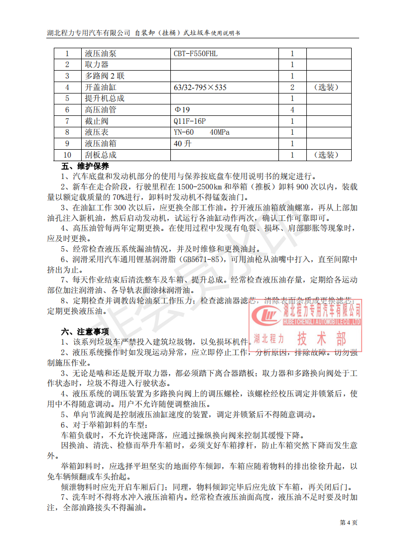 湖北程力專用汽車掛桶式垃圾車(以下簡稱掛桶式垃圾車或者勾臂式垃圾車)是用于城鎮內的垃圾收集、轉運、卸料作業的專用車輛。該車是由汽車底盤、自卸油缸、提升機總成、頂蓋(選裝)、附車架、垃圾箱體等組成。該車操作由液壓控制系統來完成,控制方式可以為手動或電氣控。該車主要用于城鎮垃圾的垃圾收集、轉運和卸料。操作開提升控制閥將垃圾桶隨提升機向上升起并翻轉傾斜,桶內垃圾被倒入車廂內完成垃圾單次裝載,反向操作提升控制閥,垃圾桶隨提升機而放下;完成垃圾裝載后再進行傾卸時,操作自卸控制閥,垃圾箱繞后翻轉軸傾斜體舉,箱體后門打開,垃圾傾卸出箱體;起該車由液壓控制系統來完成該車的提升機的上升和下降及垃圾的自卸功能,降低了工人的勞動強度和改善了工作環境。該垃圾車的收運方式是目前國內泛采用的垃圾收集轉運方式,其專用裝置的功能均以汽車發動機為動力,通過液壓機構手動或電控、氣控來實現。車輛的箱體采用優質炭鋼板全密封焊接結構,具有強度高、重量輕,防塵、防溢不產生二次污染等優點。垃圾車整車基本性能與原底盤車相同,用戶請參閱原底盤車使用手冊。本用說明書僅介紹專用改裝部分的有關操作、檢查和維修保養。在使用車輛前,我們強烈要求您能夠通讀本說明書,并對其中的操作程序做到得心應手。我廠對產品將會進一步改進。產品的改進、性能的提高、結構的不斷完善恕不另行通知,從而有某些說明不適用于您的特定車輛,敬請諒解。下面是湖北程力自裝卸式垃圾車(掛桶式垃圾車)使用說明書:![]() ![]() ![]() ![]() ![]() ![]() |