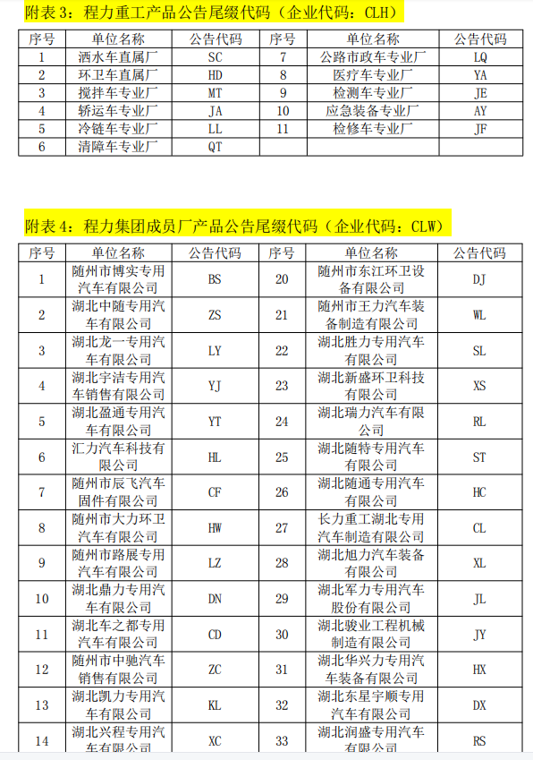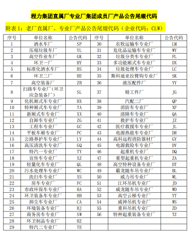 程力重工產(chǎn)品公告尾綴代碼(企業(yè)代碼:CLH),程力集團(tuán)成員廠產(chǎn)品公告尾綴代碼(企業(yè)代碼:CLW)