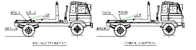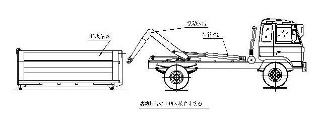 拉臂式垃圾車(車廂可卸式垃圾車)使用說明 一、概述 什么是勾臂垃圾車? 車廂可卸式垃圾車又稱拉臂式垃圾車(以下簡稱垃圾車)是用于城鎮(zhèn)袋裝、散裝生活垃圾物的收集、運輸、卸料作業(yè)的專用車輛。 該車是由汽車底盤、拉臂主油缸、附車架、翻轉(zhuǎn)架、支撐腿(選裝)、鎖緊架、鎖緊油缸及多路換向閥等組成。翻轉(zhuǎn)架一端連在附車架上,其另一端設(shè)有活動拉臂,中間安裝有鎖緊系統(tǒng);活動臂油缸一端連在活動臂上,另一端連接在附車架上;鎖緊機構(gòu)通過鎖緊油缸的動作可以在箱體自卸時將附車架上的箱體與翻轉(zhuǎn)架及拉臂連為一體,在主油缸伸出時形成自卸角,也可以通過鎖緊油缸的收回把翻轉(zhuǎn)架與附車架鎖緊為一體,利用主油缸的收回或伸出使活動拉臂將地下的垃圾箱拖拉至附車架上或從附車架上放回到地面。 該車可將地下垃圾箱內(nèi)的垃圾及垃圾箱一同拉至車上運走同時可自卸,降低了工人的勞動強度。該垃圾車的收運方式是目前世界上廣泛采用的垃圾收運方式,可以實現(xiàn)一車多箱,大大降低了配備成本和空間等等;其專用裝置的功能均以汽車發(fā)動機為動力,通過液壓機構(gòu)手動或電控來實現(xiàn)。車輛的箱體采用優(yōu)質(zhì)炭鋼板全密封焊接結(jié)構(gòu),具有強度高、重量輕、不產(chǎn)生二次污染等優(yōu)點。 二、結(jié)構(gòu)簡圖 三、操作步驟 在裝載垃圾前,空載運轉(zhuǎn)達到6個標準氣壓時,掛上取力器(駕駛室內(nèi)方向盤左下方),檢查各部件有無泄漏或異常后,再按照操作指示牌指示位置進行操作;其具體操作步驟如下: 拉起垃圾箱體 步驟1.將鎖緊鉤操作手柄推至收回位置,鎖緊油缸收回,使鎖緊架收回并將翻轉(zhuǎn)架與附車架鎖緊固定;如圖: 步驟2.將拉臂操作手柄拉起到伸起位置,拉臂油缸伸出,活動拉臂繞翻轉(zhuǎn)翻轉(zhuǎn)架前鉸鏈軸旋轉(zhuǎn),拉臂處于鉤箱位置,適當調(diào)整拉臂鉤高度并與箱體彎鉤對準;如圖: