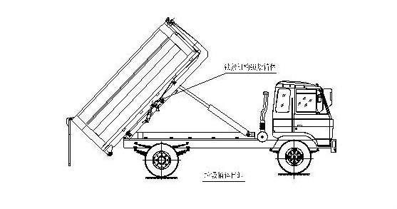 完成垃圾箱體的上車工作,松開取力器,整車可以運輸行駛。 步驟5. 在卸垃圾前,整車運轉(zhuǎn)達到6個標準氣壓時掛上取力器,打開垃圾箱后門鎖緊裝置,在前級二聯(lián)多路閥處,首先確定鎖緊架鎖緊垃圾箱體(拉起鎖緊鉤操作手柄至鎖緊位置),然后拉起拉臂操作手柄至伸出位置,垃圾箱體備傾斜舉起垃圾卸出;如圖: