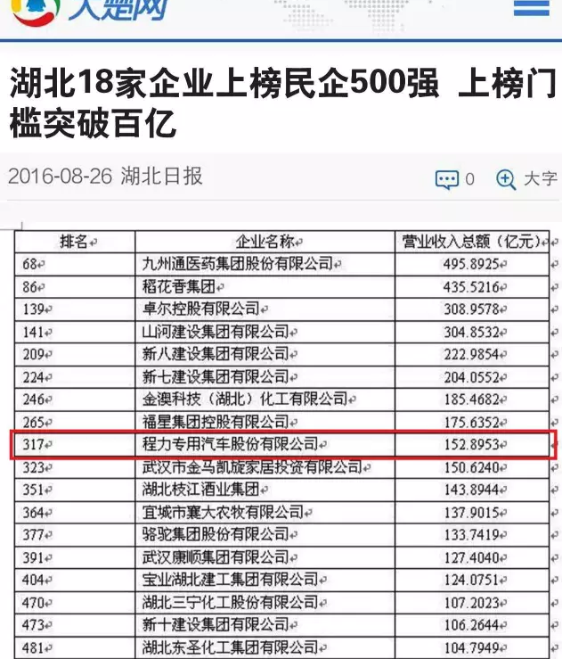 湖北程力專用汽車股份有限公司再次入圍“中國民企500強”榜單第317位