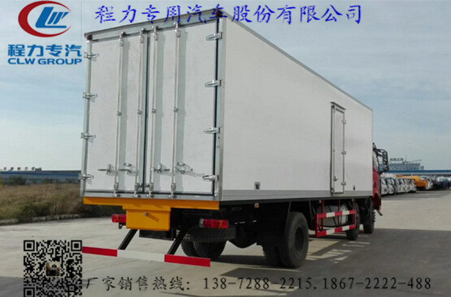 內置槽鋼焊接骨架或者玻璃纖維超輕高強度骨架,填充8cm聚氨酯保溫層,不銹鋼包角,不銹鋼門框,不銹鋼門鎖件,防滑花紋鋁底板,選裝T型材通風槽,配后雙開門,車廂右側可以加開側門,-5~-18度制冷機組可選。選裝進口品牌制冷機組。