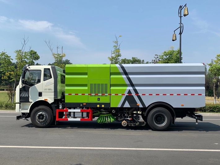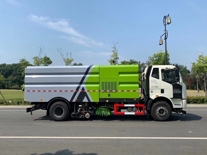 帶2個(gè)中置掃盤;中置超寬吸嘴;雙層吸塵筒; 康明斯170馬力副發(fā)動機(jī);臺灣液壓閥;大力馬達(dá);德國高壓水泵 (前沖/側(cè)噴/中噴/后噴霧)/側(cè)沖洗水槍/垃圾箱自潔裝置); 萬向高壓路沿清洗;威龍低壓泵(前沖),氣動球閥控制; 4mm不銹鋼垃圾箱;不銹鋼水箱;德國控制器;尾部箭頭燈; 機(jī)油、垃圾箱、水箱均帶防溢或低位報(bào)警裝置;倒車及洗掃狀態(tài)室內(nèi)監(jiān)視器; 多種語音提示;倒車自動保護(hù)、防傾倒垃圾翻車保護(hù)、檢修安全保護(hù); 20m高壓沖洗卷盤;刷臂轉(zhuǎn)動機(jī)構(gòu)使用德國進(jìn)口高新耐磨工程隔套,免打黃油; 冷彎無縫液壓油管;運(yùn)動控制器一鍵電腦控制。洗掃寬度3.5m;吸入粒度p110mm。 湖北程力國六解放洗掃車多方位圖片: