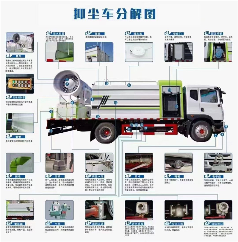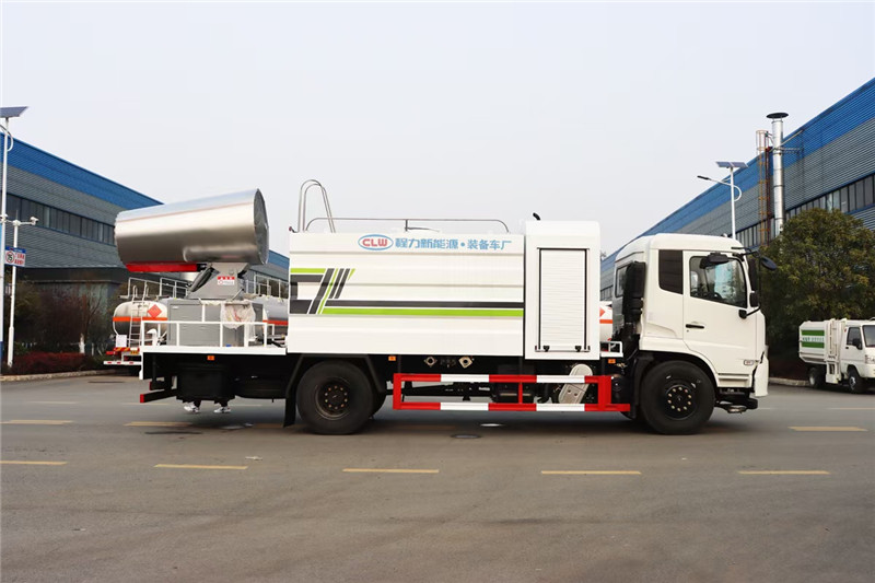 湖北程力國六東風天錦60-100米抑塵車(方罐)程力威牌CLW5181TDYD6型多功能抑塵車廠家配置: 湖北程力國六東風天錦抑塵車底盤配置:底盤采用東風天錦國六底盤,公告型號:CLW5181TDYD6,康明斯6缸ISB210馬力發動機,4700軸距,275真空胎,6檔變速箱,原裝空調,ABS。 湖北程力國六東風天錦抑塵車上裝配置:罐體容積11.3立方,罐體為方形罐,罐體內部做防腐,罐體鋼板采用Q235碳鋼鋼材,整車具備灑水車的一切功能(前沖、后灑、側噴、平臺高炮),氣動球閥控制灑水功能,水位報警器,標配億豐60/90水泵,自流閥及消防接頭各1個、水管2根。后平臺安裝一臺60米霧炮。 湖北程力國六東風天錦抑塵車霧炮參數:CLW-100型60米,副發電機組功率50(Kw),風機功率15(Kw),不銹鋼多級離心泵功率5.5(Kw)。100米無線遙控操作,霧化距離60米(靜風室內距離)實際射程:(霧化射程會受濕度、溫度、風速等各方面天氣因素的影響,另外天氣干燥地區一部分在空中被蒸發掉)。 | 湖北程力國六東風天錦60-100米抑塵車(方罐)程力威牌CLW5181TDYD6型多功能抑塵車圖片價格: